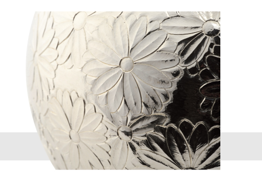 TEAPOT spherical form, the whole surface is engraved in low relief with overlapping chrysanthemums. A short spount and silver loop handle, the pull-off cover with a rock crystal finial. Edinburgh 1999.