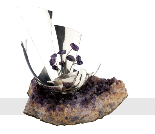 MODEL of an abstract flower arrangement in amethyst and silver. The flowers are silver stems mounted with polished amethysts set within silver panels representing leaves. All set on an amethyst rock. London 1972.