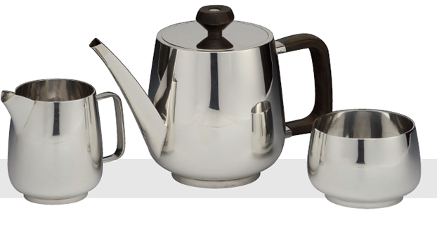 TEA SERVICE comprising tea pot, milk jug and sugar bowl. All with ovoid cross-section, the tea pot has a black handle and knob. Birmingham 1970.