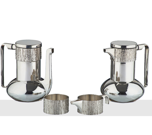 TEA and COFFEE SERVICE the tea and coffee pots both with a textured frieze at the top, the milk and sugar with the same texturing all over. Sheffield 1978.