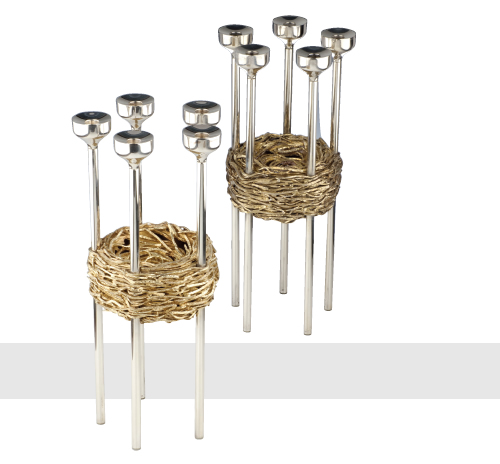 CANDELABRA with reed warblers' nests in silver gilts suspended between the five rods that flow into the candle sockets. The lid of each nest lifts to reveal a removable bowl. Lawrence advises the nests took 70-80 hours each to weave. The pair was reunited having been split. London 1972.