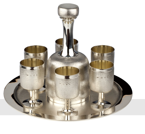 DECANTER, GOBLETS and TRAY of cylindrical form with a combination of textured and polished surfaces. The texturing resembles an 'onion skin'. London 1973.