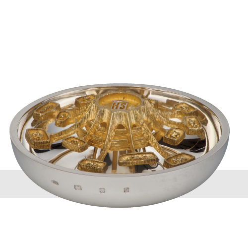 CENTREPIECE made for Hill Samuel whose initials appear at the hub. Circular in form, the two rings of the gilt openwork cover symbolises the wheels of industry and commerce while the crystalline structures represent the bank's subsidiaries. Cased. London 1973.