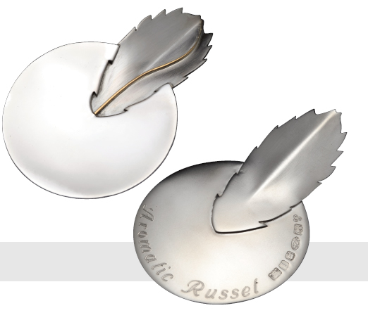 CADDY SPOON in the form of an apple. With a circular polished bowl, the satin handle is in the form of a leaf which is cut into the bowl. The handle is set with gold wire. The back is engraved Aromatic Russet. London 2008.