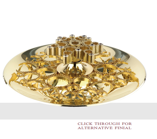 CENTREPIECE in silver gilt with two alternative detachable finials - a candleholder for 12 candles and an amethyst crystal in an openwork support. This is the first centrepiece Devlin retailed. London 1968-9.