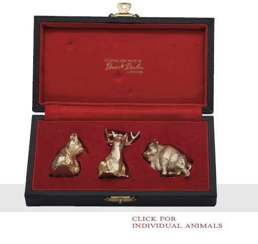 MODEL set of animals in its fitted case was made for the Stock Exchange. The silver gilt animals are a bear, stag and bull, which are also financial terms. London 1977-1985.