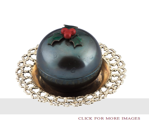 CHRISTMAS NOVELTY miniature in the form of a traditional Christmas Pudding. The exterior of the compacted spherical body of the pudding is oxidised, the holly that surmounts it is enameled and the platter on which it is presented is gilt. The cover lifts to reveal a dozen silver charms. London 1974.