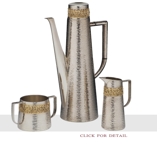 COFFEE SERVICE known as the Figured Coffee Service as each piece has a gilt band of figures. A exterior surfaces, with the exception of the top of the pot lid, are textured. This piece was exhibited at Devlin's 25 year retrospective in 1983. London 1975.