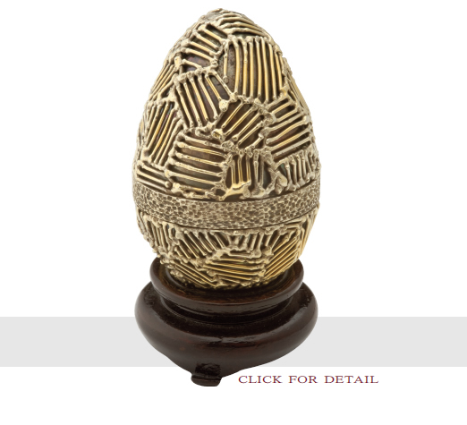 EGG with oxidized body with a gilt overlay of handworked 'patches' comprising either five or six strands. The egg has no surprise - it is empty. This and the two 1968 eggs that follow are believed to be from a very small production run. London 1967.