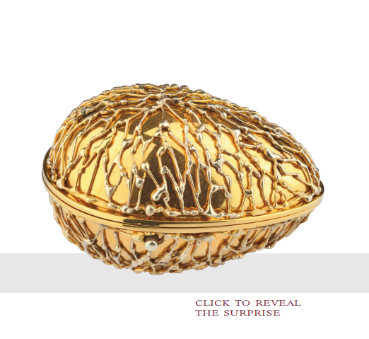 EGG with its gilt body with applied gilt wirework. The hinged cover, which opens cross section, opens to reveal a an 18 carat gold ant on a pieces of malachite surrounded by gilt twigs. This piece is unique. Cased. London 1969.