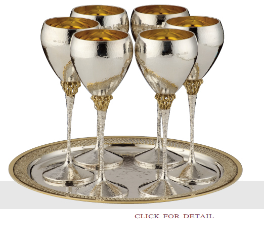 GOBLETS AND TRAY The bowls of the goblets are hand raised and supported on the slender tapering chiseled stems by gilt figures of men. The circular tray has a spot hammered surface and a gilt border. London 1974.