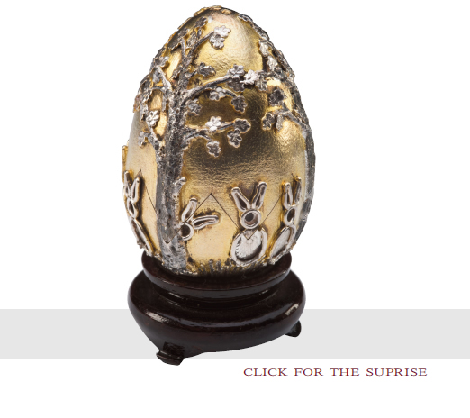 EGG the exterior decorated in relief with stylised silver rabbits and oxidized silver trees against a gilt background. This egg is unique. Cased. London 1972.