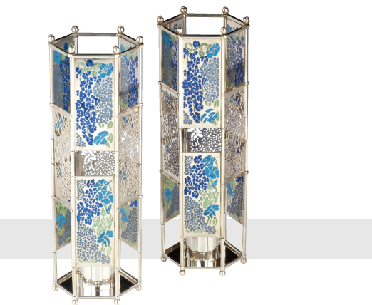 CANDLESTICKS in silver and plique-à-jour enamel. The upright hexagonal-shape open-work frames with alternating pierced and enamelled panels of stylised flowers. Enamels in blues and greens. The bases centred with a nozzle. London 1985.