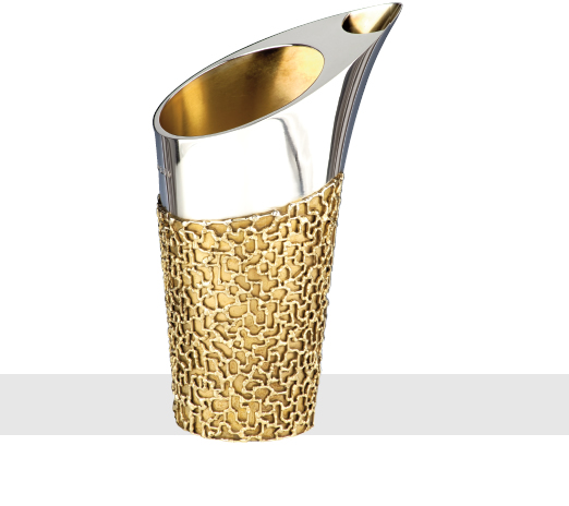 ICE PITCHER, the cylindrical body flaring from the base and terminating in an elongated lip. The body partially applied with 'filigree' work. London 1969.