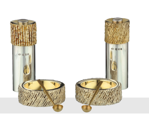 CONDIMENT SET comprising a pair of gilt salts with textured sides with accompanying gilt spoons and a matched pair of pepper mills with textured gilt tops and plain silver bodies. London 1969.