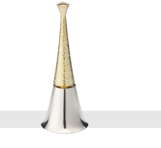 TABLE BELL of steeple form, the top culminating in a knob form. The handle in textured gilt, the bell polished silver. The knob is engraved: RdeV. London 1969.
