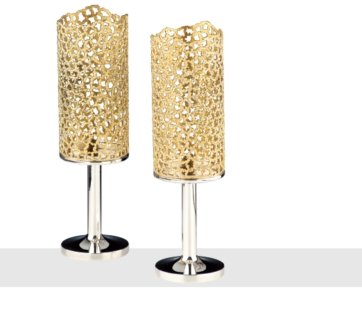 CANDLESTICKS a pair on a tubular stem between a circular base and drip pan. The gilt 'filigree' cylindrical shades that have been made by applying an acetylene torch to a silver cylinder. London 1971.