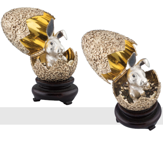 EGG with a textured gilt exterior. The hinged cover opens to reveal the head of a floppy eared rabbit silver rabbit peeping from a ground of gilt leaves, Limited Edition. Cased. London 1972.