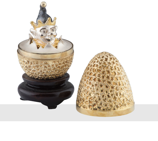 | EGG with textured gilt exterior. Its pull-off cover lifts to reveal an enameled and gilt head of a clown emerging from an aperture. The head is on a spring, so wobbles. Limited Edition. Cased. London 1972. |