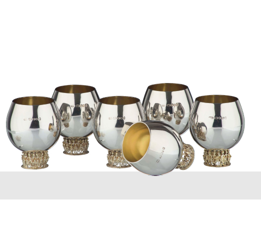 LIQUEUR GOBLETS A set of six. The plain ovoid bowls supported on collet foot comprising naïve figures of adults and children. London 1977.