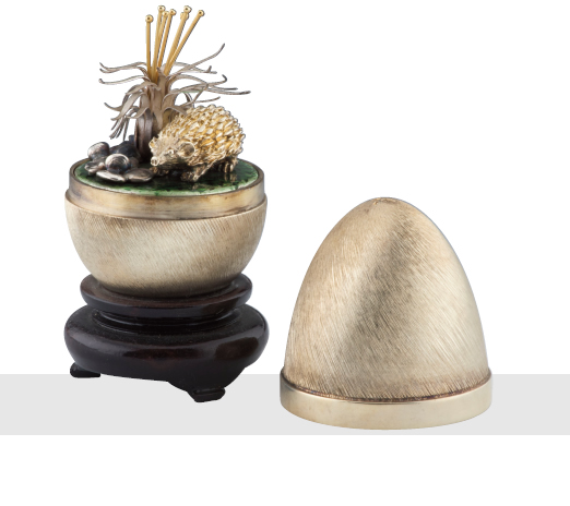 EGG with gilt finely textured exterior. Its pull-off cover lifts to reveal a silver and gilt hedgehog near vegetation on a green enameled ground. Cased. Limited Edition. London 1978