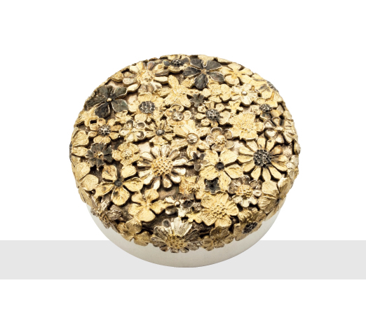 BOX, the pull-off cover applied with silver gilt, silver and oxidised silver flowers. London 1980.