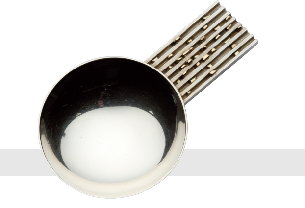 CADDY SPOON with a large circular bowl. The broad handle is ridged and set with small gold globules both in and on the ridges. London 1966.