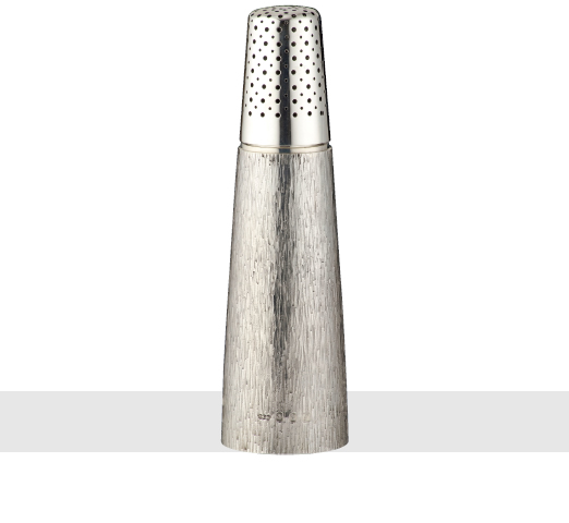 CASTER that is a very early example of Benney bark effect texturing. Made from Britannia standard silver, which is 95.84 against sterling's 92.5 per cent silver and is softer, it is possibly an experimental piece - the texturing is quite fine. London 1961.