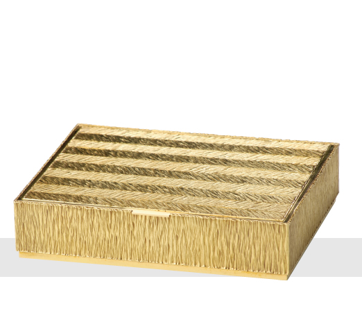 BOX An 18 carat gold example, the hinged cover set with 10 strips with the texturing going alternatively at an angle to the left and right, resulting is an optical allusion of a ridged surface. Benney only made about six gold boxes. London 1966.