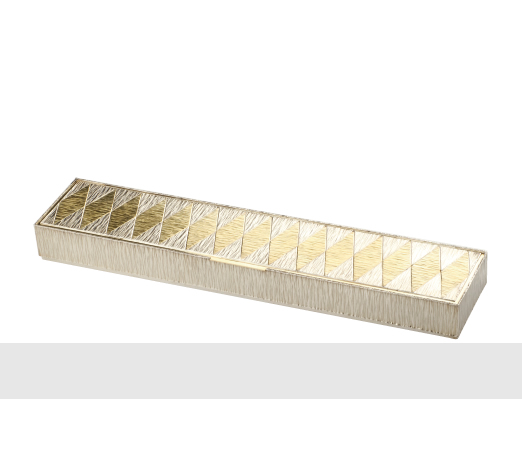 BOX in 18 carat gold and silver for pencils, the leather lined interior divided into two sections. The hinged cover with 15 diamond shapes in gold, the texture being horizontal against a silver vertical textured background. London 1968.
