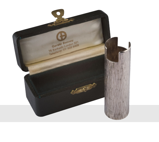 POCKET LIGHTER HOLDER with textured exterior for a disposable lighter such as a 'Clipper' in its original case. Bears Benney's maker's mark and the base is engraved 'Gerald Benney, London. Sterling Silver'. Presumably made for the US market. Circa 1970.