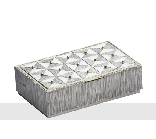 BOX in silver and 18 carat gold with leather interior. The hinged cover with optical allusion engraving to represent pyramids with a gold sphere at their apex. Note that the direction of the engraving differs from the 1967 specimen in the Collection. London 1972.