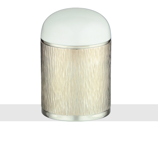 BOX of canister form for cigarettes the pull-off cover enameled in white over a plain surface. London 1974.
