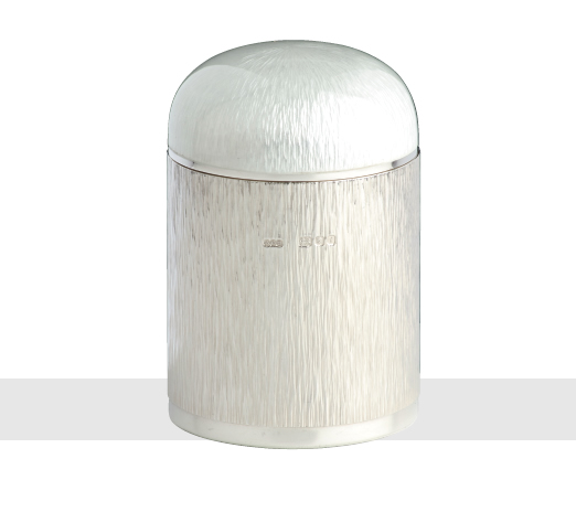 BOX of canister form for cigarettes, the pull-off cover enameled in translucent oyster over a finely textured surface. London 1974.