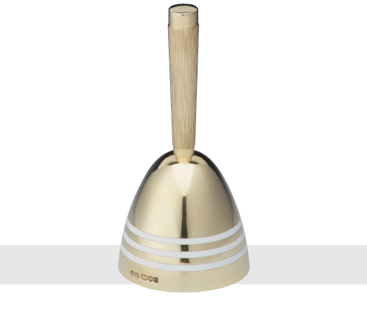 TABLE BELL in silver gilt and enamel. The tapered bark textured handle with polished top, the polished body with three white enamel bands. A gift from Gerald Benney to a friend. London 1976.