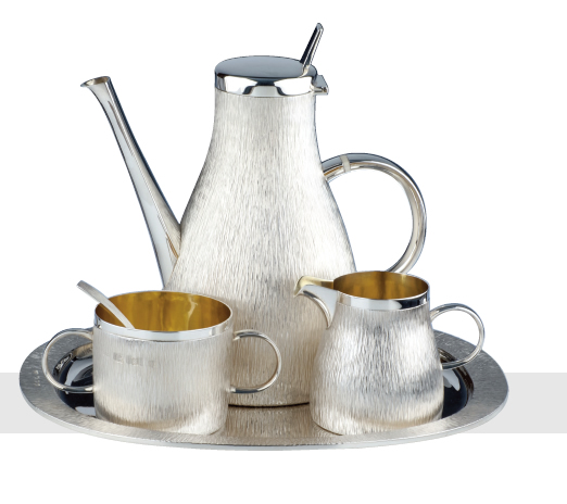 COFFEE SERVICE and tray with superb bark effect texturing that almost looks opaque. All the serving pieces and the tray are hand-raised and the sugar spoon is hand-wrought. London 1983.