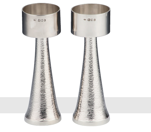 CANDLESTICKS a pair with conical with bases with 'basket weave' texturing, surmounted by cylindrical deep sconces. London 1976.