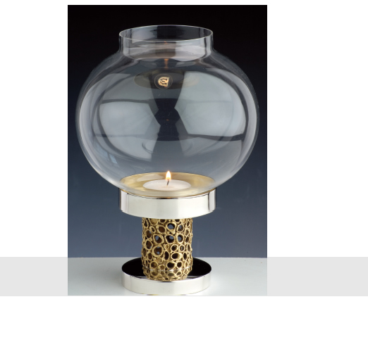 LAMP with a circular polished base from which a gilt textured cast openwork column rises with open and close circular motifs. Circular polished frip pan above. With Dartington glass globe. London 1984.