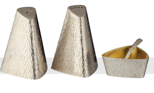 CONDIMENT SET salt, pepper and mustard together with its spoon. Of triangular form, the bodies have a textured finish. London 1973.