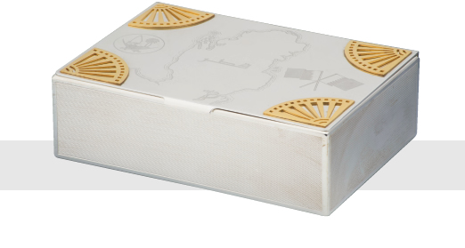CIGAR BOX made for the State of Qatar. The hinged cover engraved with a map of the State, the country's coat of arms and two of the nation's flags with an applied gilt fan in each corner. The sides engine turned. Wood lined interior. Cased. London 1993.