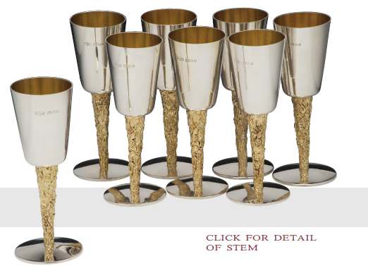 GOBLETS for sherry. The cylindrical bowls of tapering form on gilt stems that taper down to a circular base. London 1973.