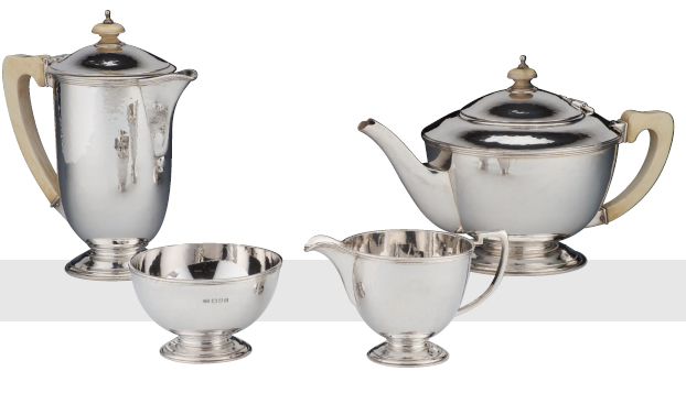 TEA SERVICE comprising four handraised pieces, the tea and hot water pots with ivory handles and knobs. London 1967.