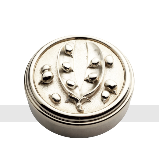 BOX of circular form, the pull-off cover featuring an open seed-pod containing some seeds, the others lying on the textured background. Designed by Jocelyn Burton, made by and bears the maker's mark of Asprey-Garrard. London 1998.