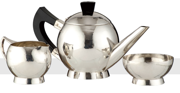 TEA SERVICE comprising teapot, milk jug and sugar bowl. The pot of ovoid form with a black hardwood handle and knob. Birmingham 1948.