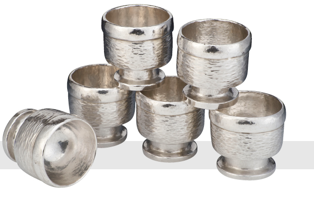 GOBLETS of circular 'dumpy' form with a short stem upon a pedestal. The body with a collet texture. Made in Britannia Silver. London 1973 and 1974.