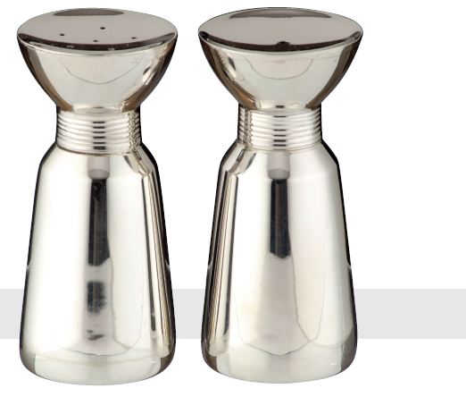 CONDIMENT SET comprising a salt and pepper shaker of slightly tapering cylindrical form terminating in a reeded band from which the flared tops emerge. Birmingham 1967.