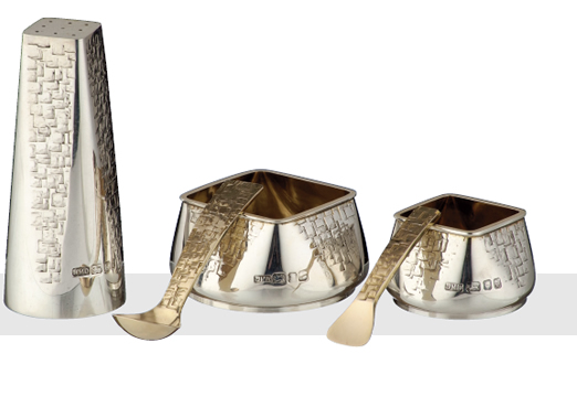 CONDIMENT comprising salt, pepper and mustard together with mustard and salt spoons. Of a curved geometric form with partial 'brick' engraving. London 1976.