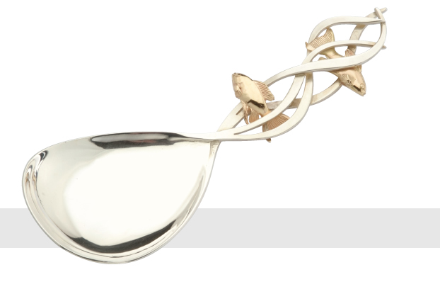 CADDY SPOON a 'tear-shape' bowl, the handle formed to represent two fish in 9 carat gold swimming through reeds. London 1999.