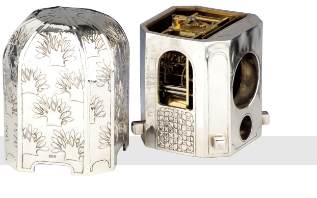 CARRIAGE CLOCK with silvered dial bearing Roman numerals. It chimes on the hour and half hour and has an alarm. The outer case, which lifts, is chased with trees bearing golden fruit. London 1978.