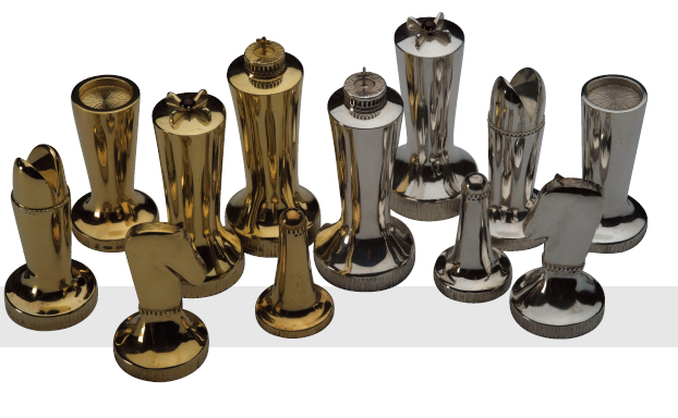 CHESS SET in silver and silver gilt of modernistic style. Made from flat sheets of silver that were hammered and soldered. The Queens' crowns are set with a single garnet. London 1974.